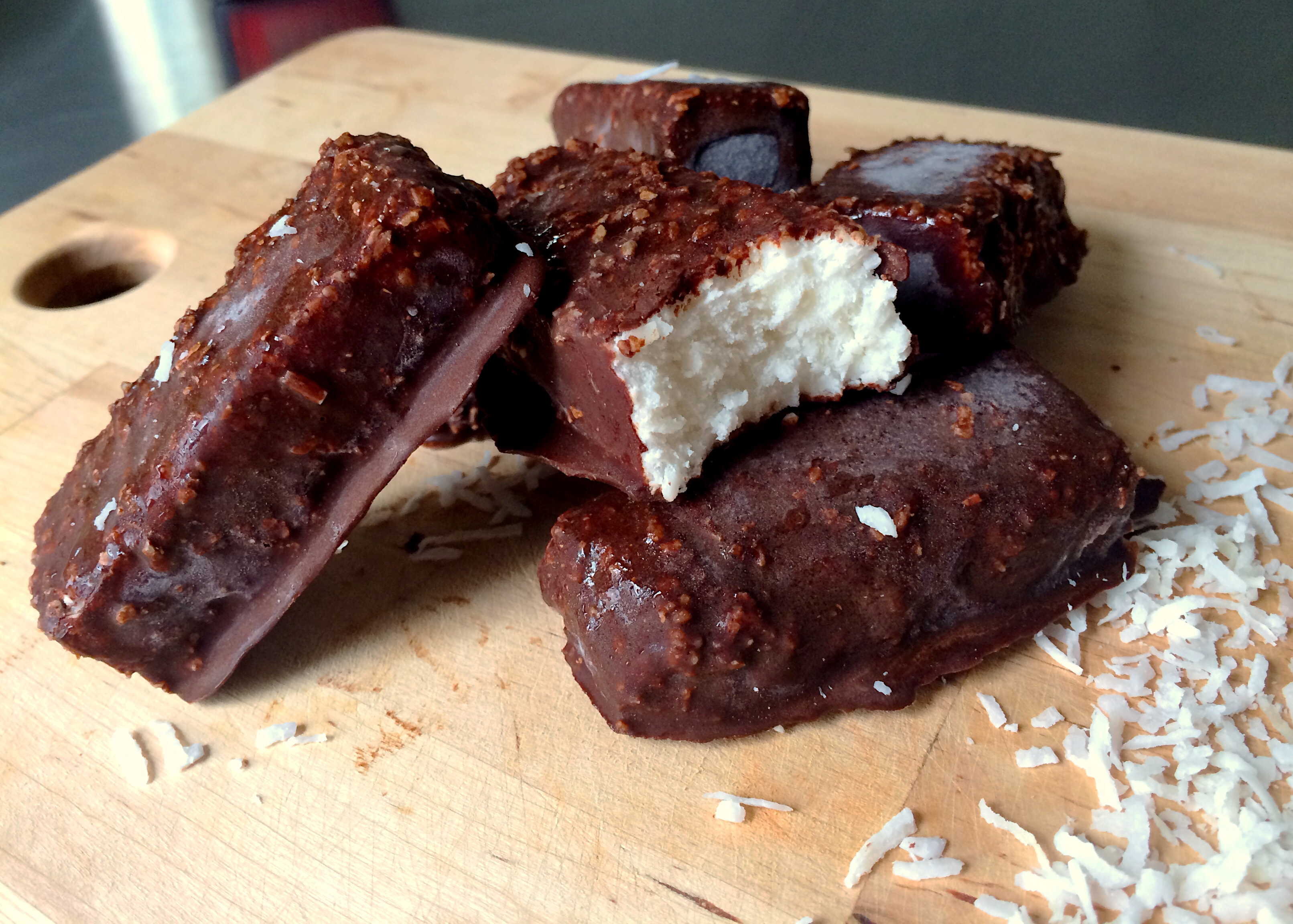 5. Grab the bounty-bars from your freezer and coat evenly in the chocolate. As the bars are already very cool, you only need to let them sit for one minute until you can coat them in a 2nd layer of chocolate. Place back in freezer until chocolate is completely set.