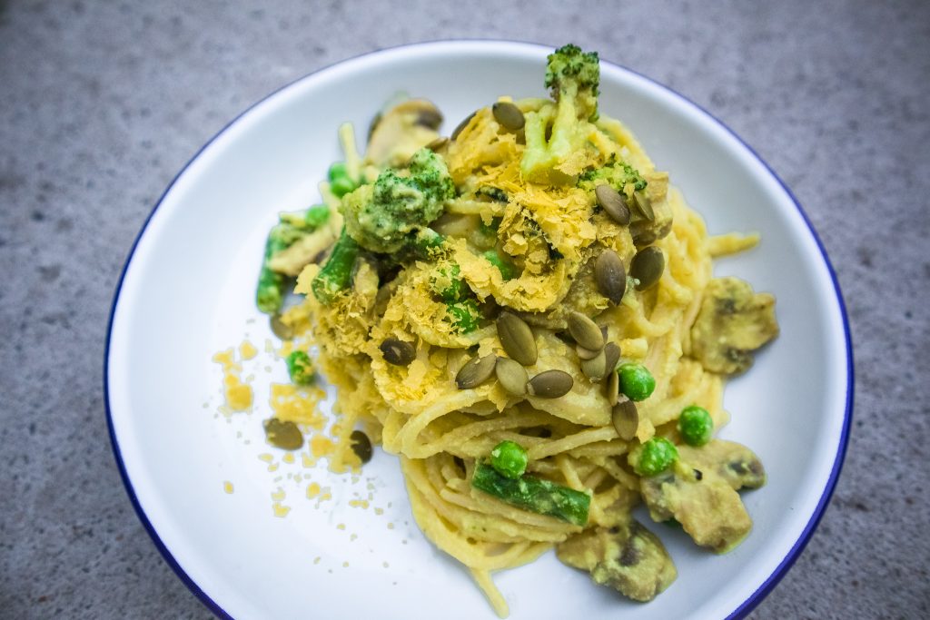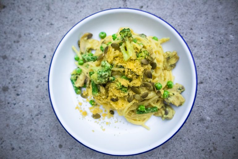 Instead of using your standard eggs & cream you’d be using for a traditional Carbonara, I’ve incorporated coconut-cream & nutritional yeast which gives it the yellow colour along with it’s ‘cheesy-ness’. Instead of bacon, it contains baby peas, broccoli, green beans & mushrooms. It’s also made on a brown-rice pasta, which makes it gluten & wheat free.