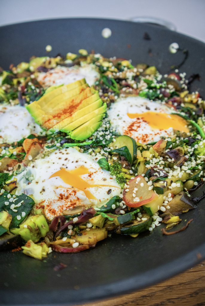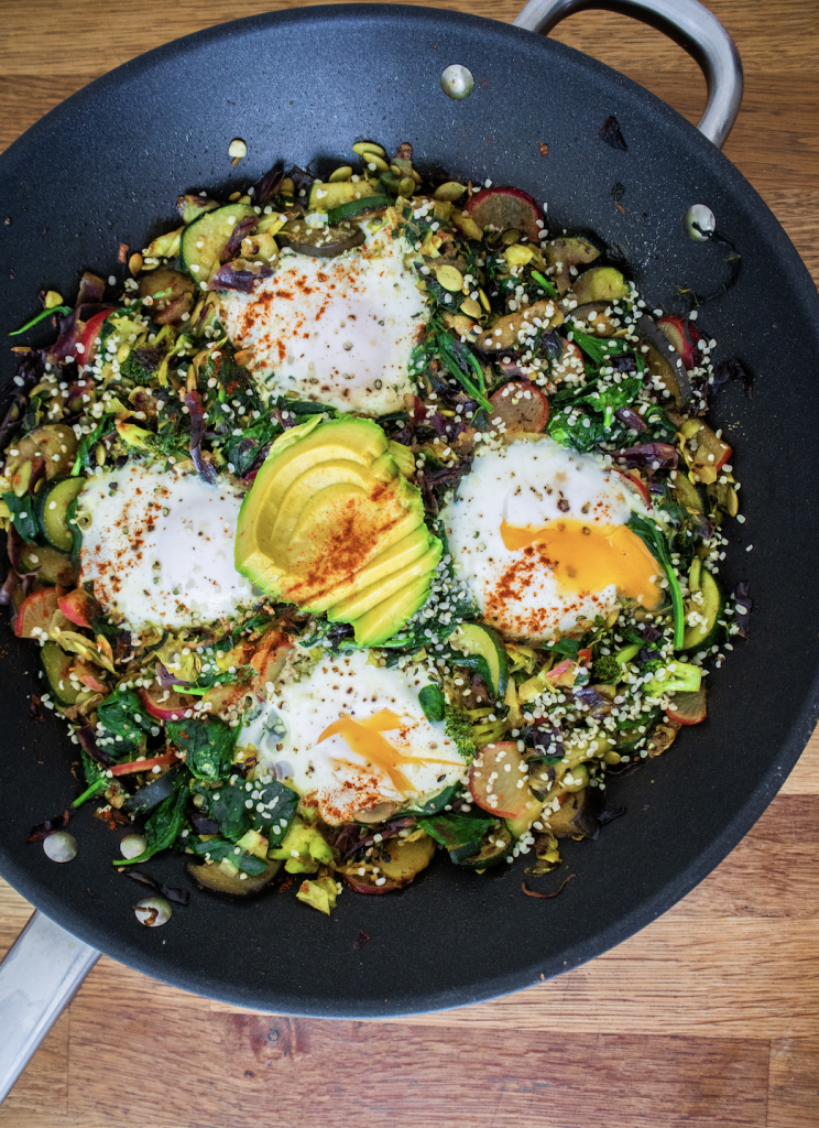 - Make 4 little wells in the vegetable mixture, and crack in your 4 eggs. Turn down the heat to a medium